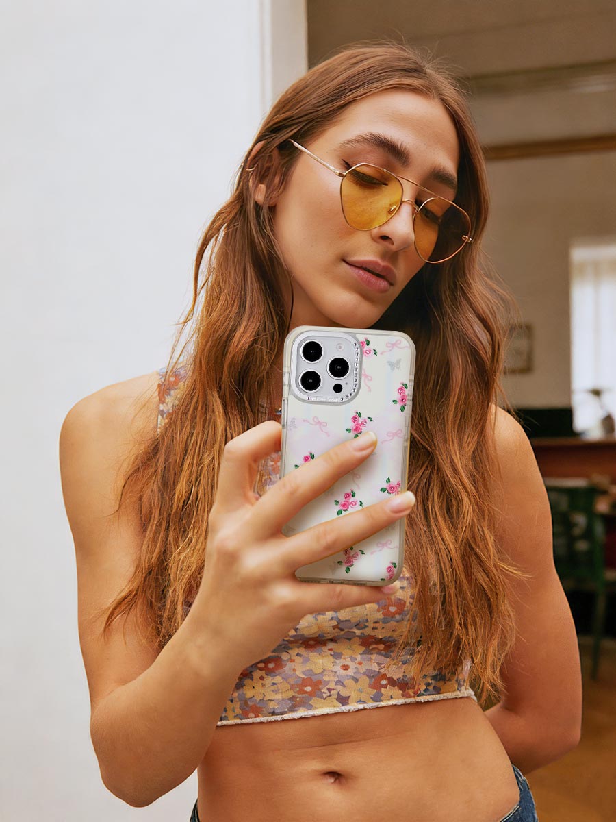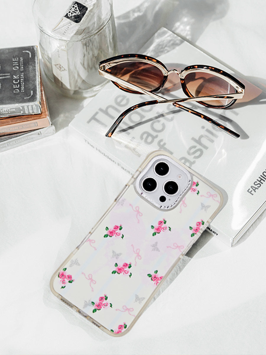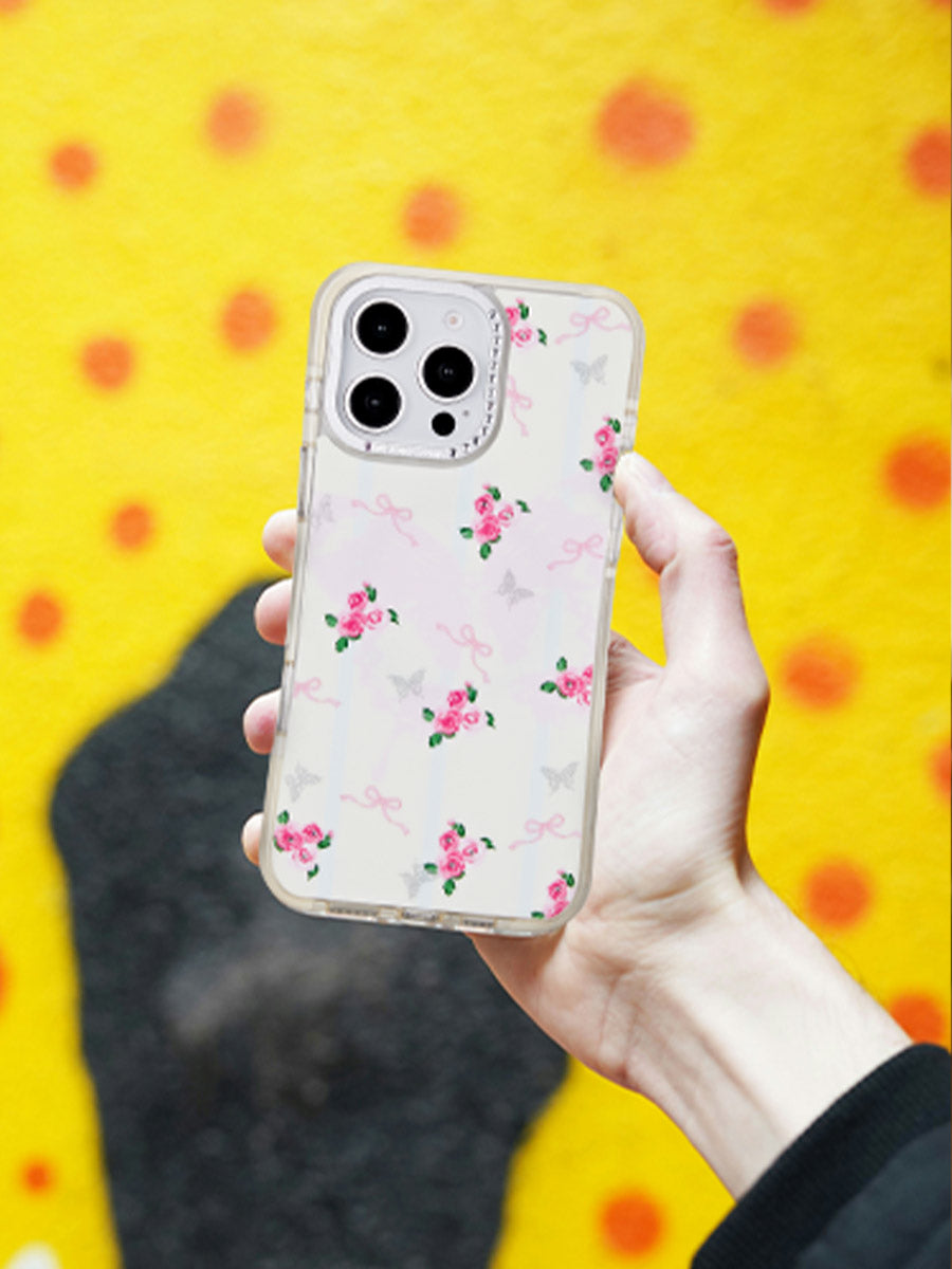 This phone case is so charming! It features cute pink roses, dainty bows, and glittery butterflies on a clear background. The camera area is adorned with tiny rhinestones for an extra touch of sparkle. Protective and stylish, it's perfect for adding a sweet, girly vibe to your phone.